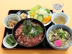丼ぶりの他に、特製そばや小鉢等付き。