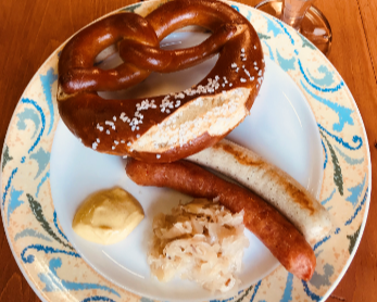 《メニュー》ソーセージ(ジューシーでソルティーな「クラカワー」、軽い風味のフワフワ食感「グリルヴースト」ザワークラウト添え)、ビールがすすむドイツパン(ブレッツェル)